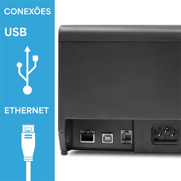 Impressora Térmica com portas USB e Ethernet e com tensão Bivolt.