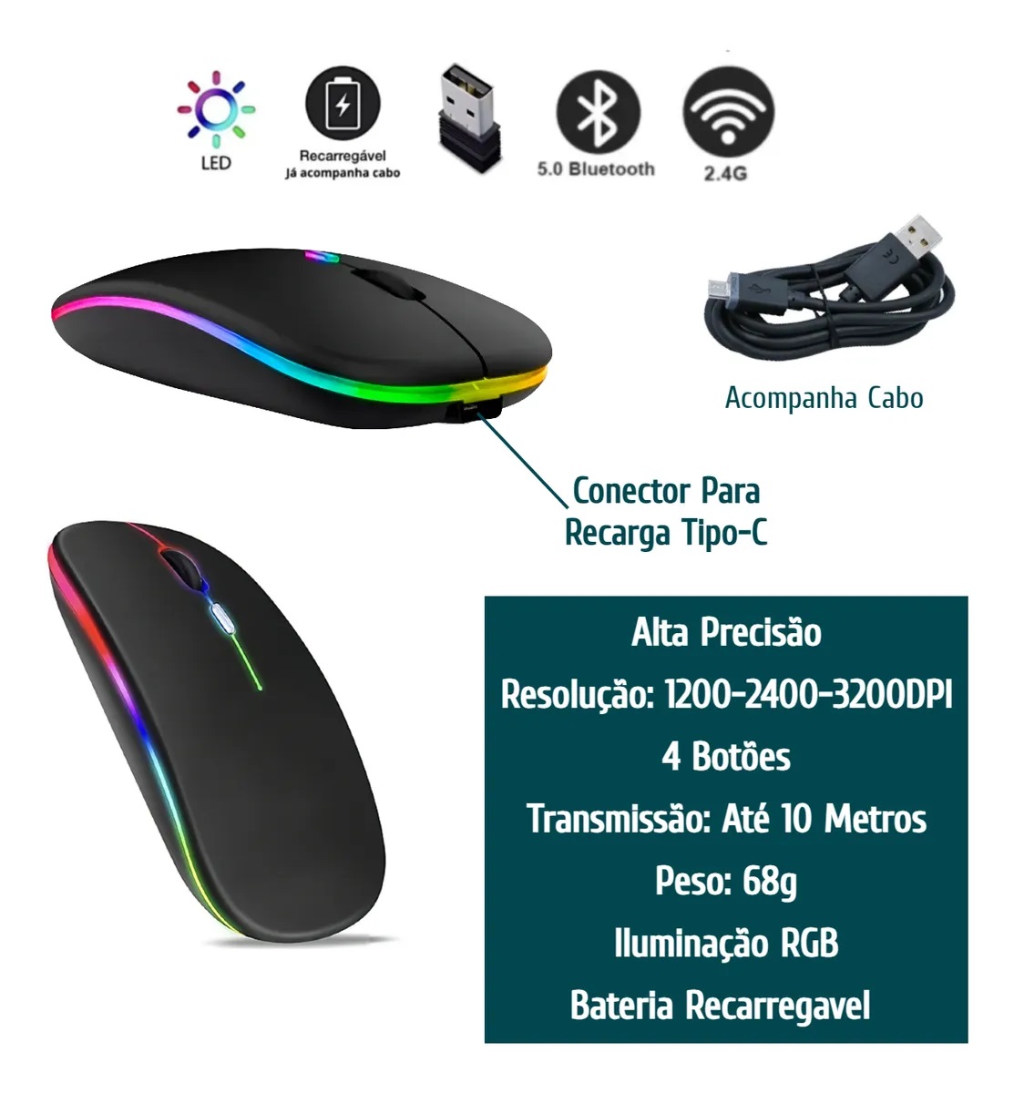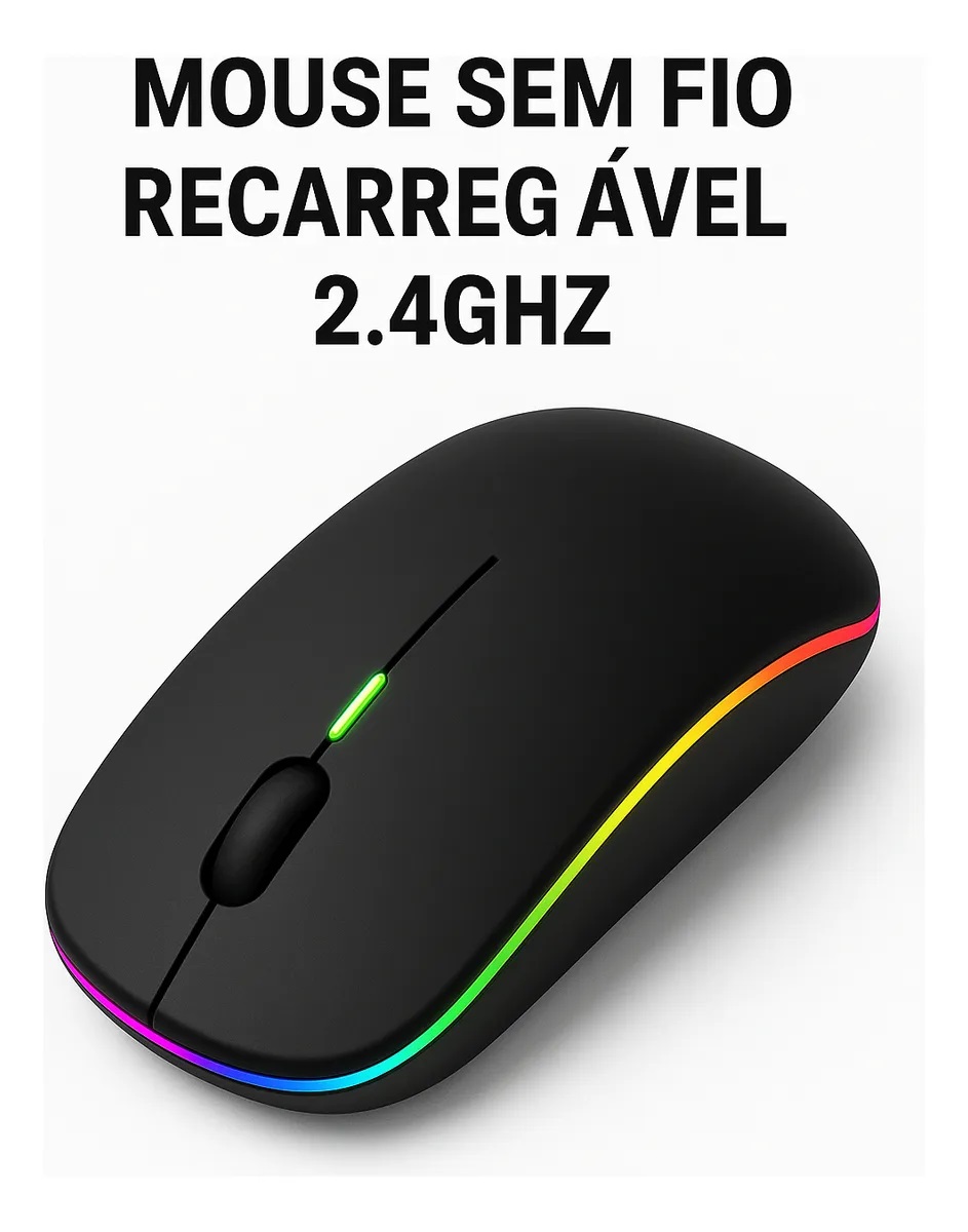 Mouse Sem Fio 2.4ghz Com Bateria Recarregável Led Rgb Preto Preto
